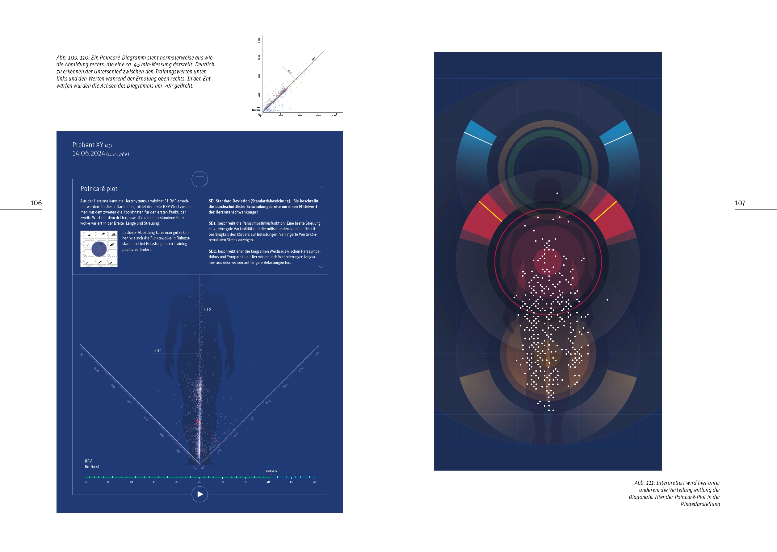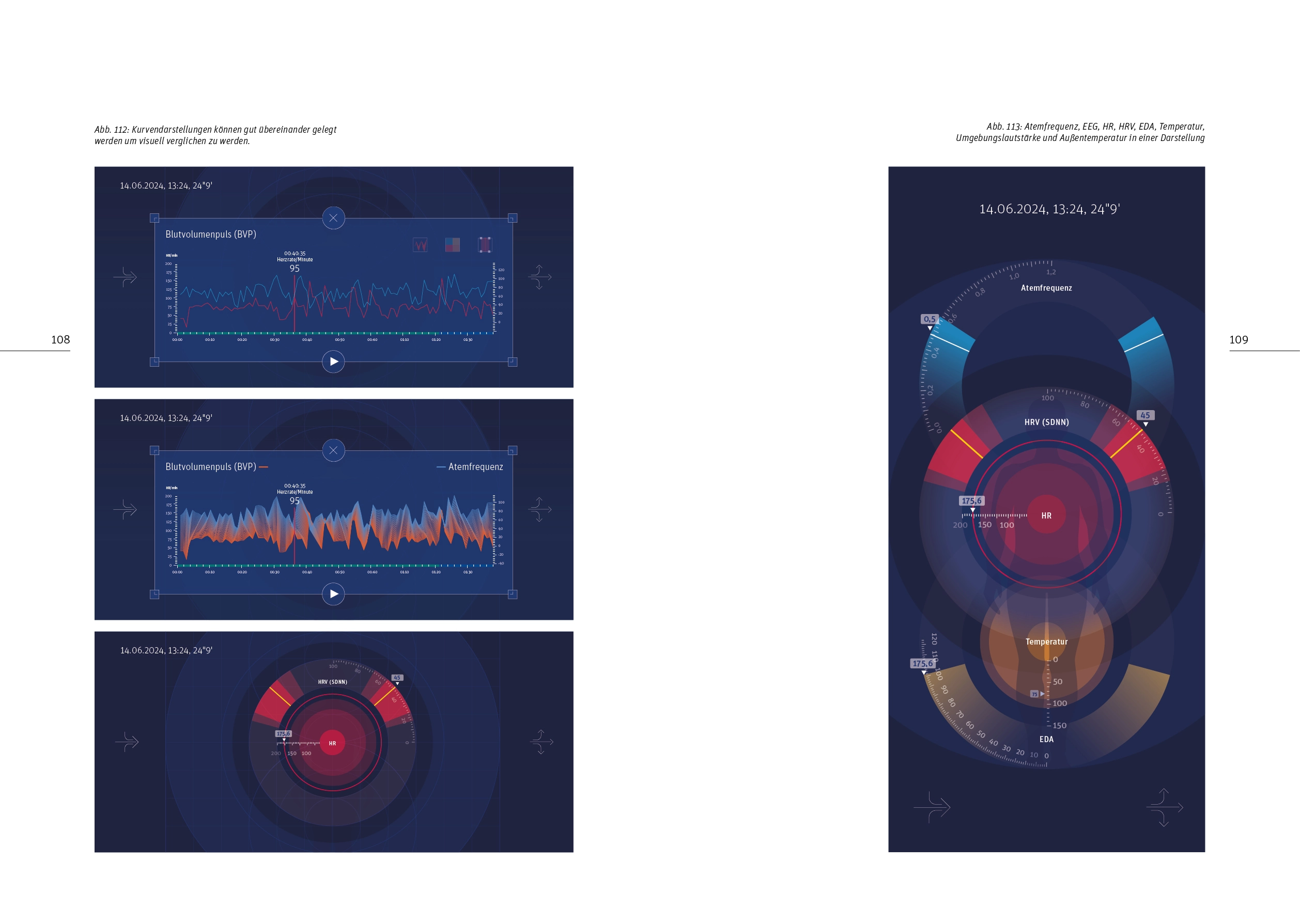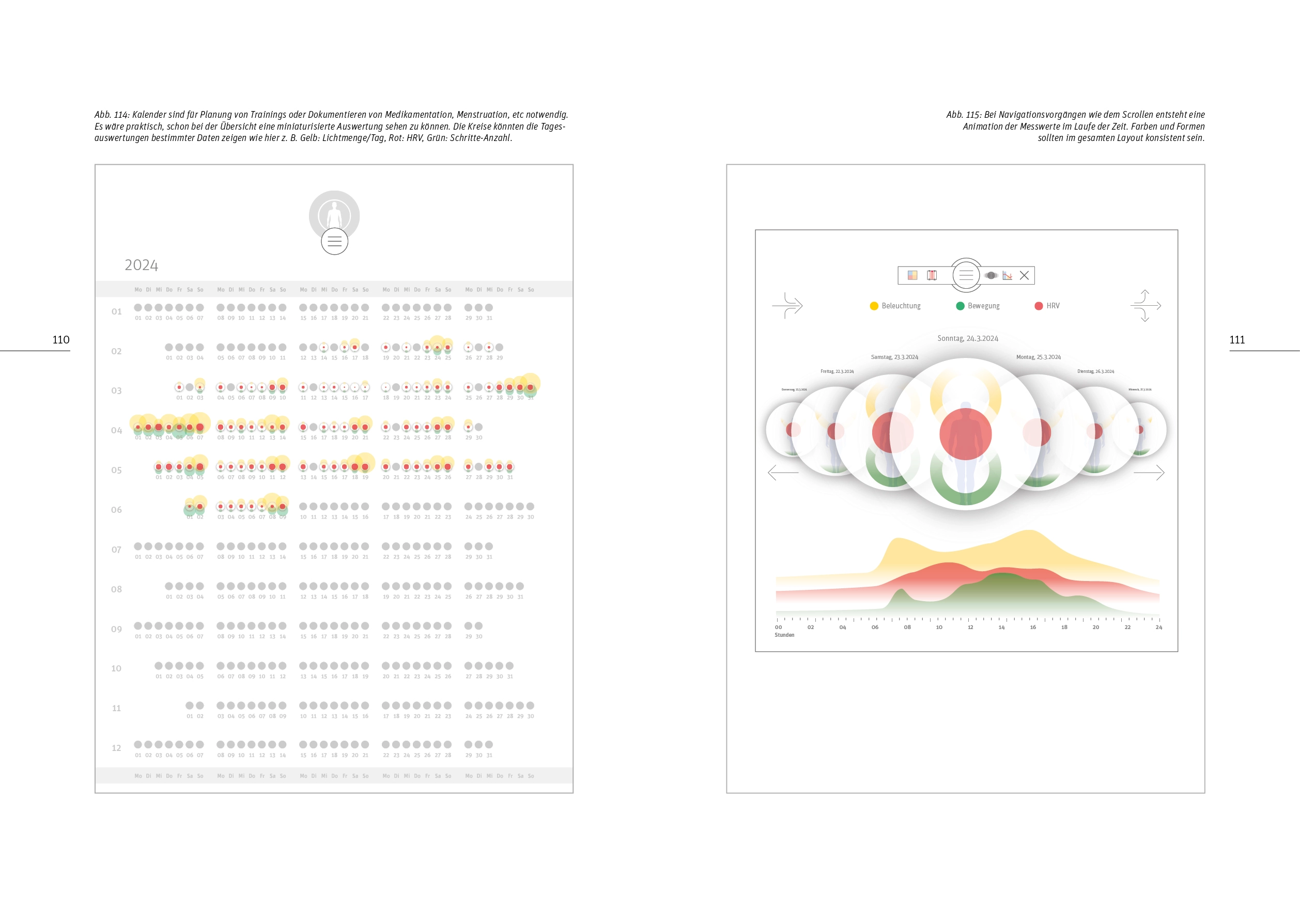 Die bevorzugte Art der Darstellung physiologischer Daten ist in Zahlenwerten oder Diagrammen. Sie sind für wissenschaftliche Betrachtungen oder Diagnostik von großer Bedeutung. Metaphorische Darstellungen sind seltener, bergen aber ein größeres Potenzial für Engagement. Das ist ein wichtiges Kriterium, da es privaten Anwendern schwer fallen kann, regelmäßig und über lange Zeiträume hinweg Messungen vorzunehmen. Welche Alternativen zu Darstellungen mit statistischen Mitteln sind möglich? Bei der Gestaltung der Benutzeroberfläche sind neben einer möglichst intuitiven Bedienbarkeit ebenfalls das Gefühl von Selbstwirksamkeit sowie Erkenntnisse aus dem Bereich Licht und Gesundheit zu berücksichtigen.